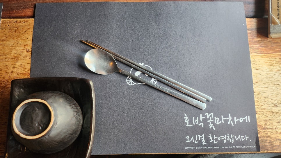 테이블에는 수저랑 식기가 미리 세팅되어 있었어요